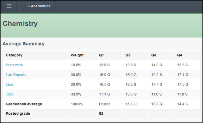 Tap a class name to view your average, standards, and attendance summaries in that class:
