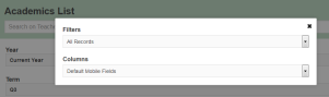 If you want to view classes for the previous year or grade term, click the Year drop-down and select Previous Year, or click the Term drop-down and select the appropriate term. To change the columns that appear, click in the upper-right hand corner of your screen: