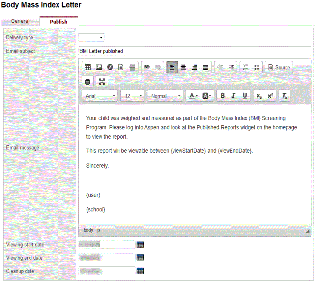 - Access the report that you want to publish (for example, go to the Health view, Student tab, Reports > Body Mass Index Letter). The appropriate pop-up appears.