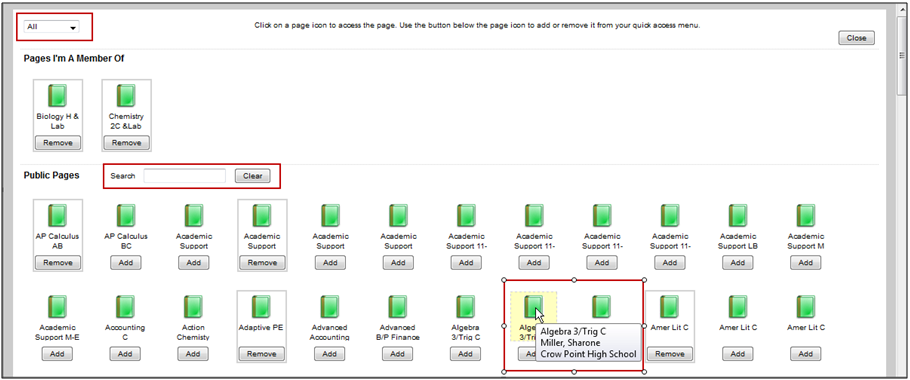 • Click the All drop-down at the top of the pop-up to select Academic, Athletic, Club, or Other. Only the type of Page you select appears. Select All to return to the full list of Pages.