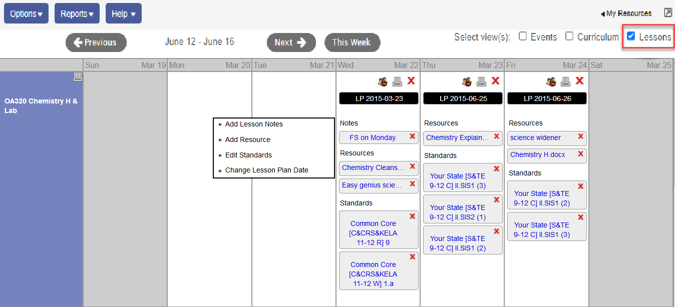 • To add a quick lesson plan you already created to a specific date, drag it from My Resources to the date on the Lessons view.