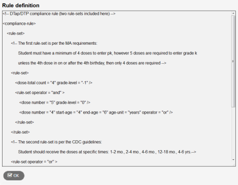 certain requirements needed for a student to be in compliance with a given immunization. These rules can be customized as needed, using XML