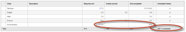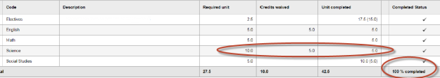 Example 1: A student needs ten Science credits, and earns five of them at your school. On summer break, she works at a local technology company, allowing her to waive five Science credits. The school does not enable the Enforce total field. Below is her Graduation Requirement Summary page (School view, Student > Transcript > Graduation Summary). Although she only earned five of the required Science credits, she has 100% completed status because the school waived the credits: |
