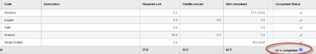 Example 2: Use the example above. This time, the school enables the Enforce total field, indicating that all required credits are accounted for in a requirement. The student is now only 82% complete towards her program of study: |