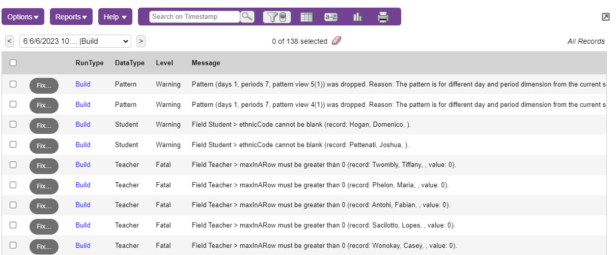 • Fatal: You must fix fatal errors in order to build the master schedule.