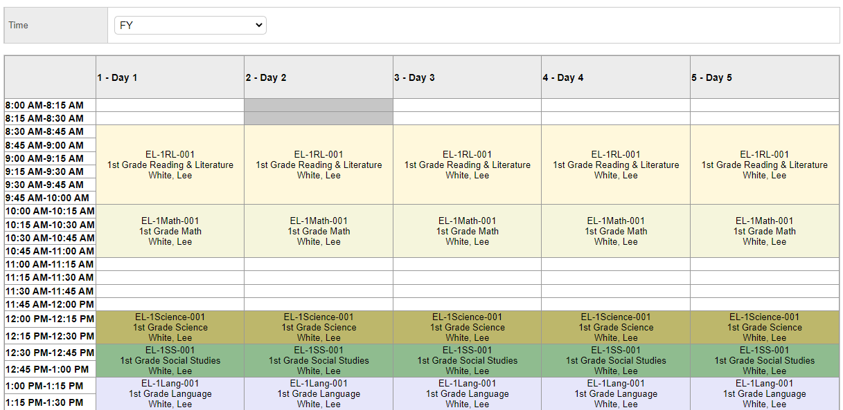 - Also at the top of the page, the Time field appears. Select the term you want to view the schedule for, or select Today. If you select the full year, the system separates courses that take place during the same period but during different terms with a dashed line.