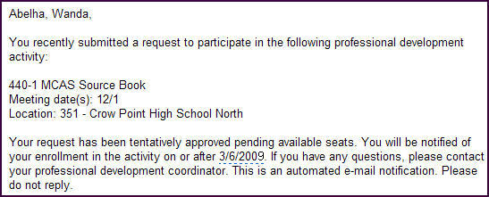 For example, the request in the example email is tentatively approved. After the enrollment close date, the administrator analyzes all tentatively approved requests and either enrolls, denies, or wait-lists those requests. Depending on the decision for each staff member’s request, the system sends the appropriate notification email.