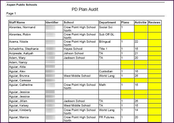 Run the PD Plan Audit report to view a list of all staff members and professional development plan statistics. Use the list to identify staff members that are missing professional development data.