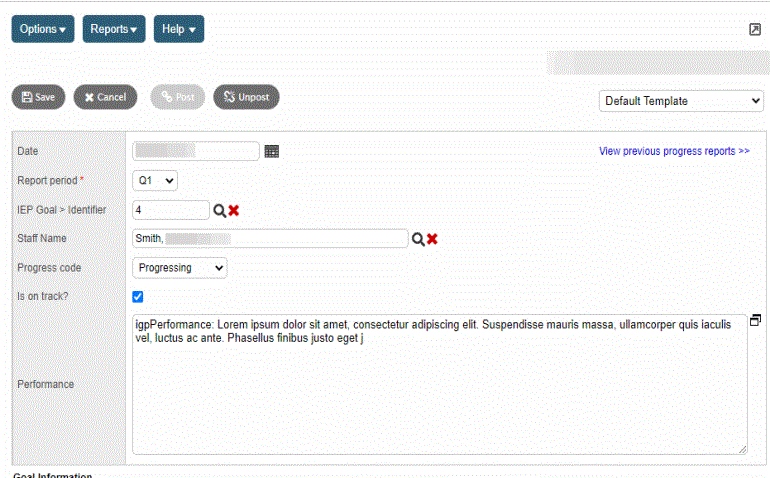 - Click Post to post the progress report, indicating you are done entering information. You can no longer edit a progress report you posted. Only special education administrators can click Unpost, to allow you to enter or edit more information.