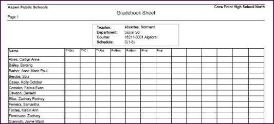 Run the Blank Grading Sheet report to print a blank grid for a section that includes the students, assignment column headers, and post columns you are currently viewing on the Scores page. Use the sheet as a worksheet for your grades: