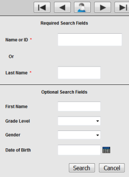Depending on your district's Student preferences, the Student Search icon appears in the record navigation bar (in place of ). To search for a different student, click . A pop-up appears: