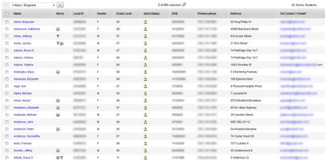 The Student List displays the active students in your school or district, depending on which view you log on to: