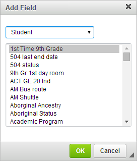 Click the drop-down to select the appropriate table for your field. For instance, if you want to add a field for the student’s State/Province, you would select the Physical Address table. The pick list refreshes to display all fields in that table. Select the appropriate field, and click OK.
