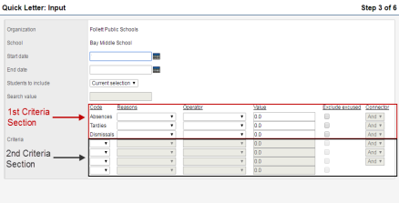 • The 1st criteria section includes a selection of preset, common attendance codes (for attendance-related letters) or conduct record types (for conduct-related letters) that you can use as criteria for your letter.