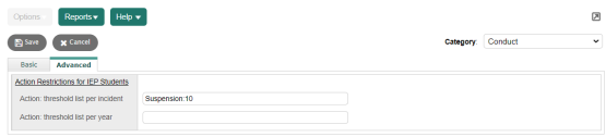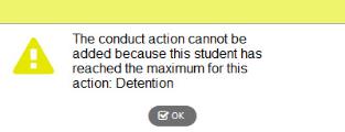 This field applies only to students who are on IEPs. It prevents a user from entering a conduct action for an IEP student after a defined threshold of actions per year has been met. Type an action, separated by a colon (:) and a number to indicate the number of units/days of the action is allowed for a special education student for a school year. When the number of units/days per year hits the threshold and a user enters a subsequent action, the following warning appears: