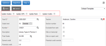 • Enable - Unchecked: to enable auto-calculation of a student's credits, GPA, grades or rank when you manually change a grade on his or her transcript, and to have the Update checkboxes deselected on the student's transcript page: